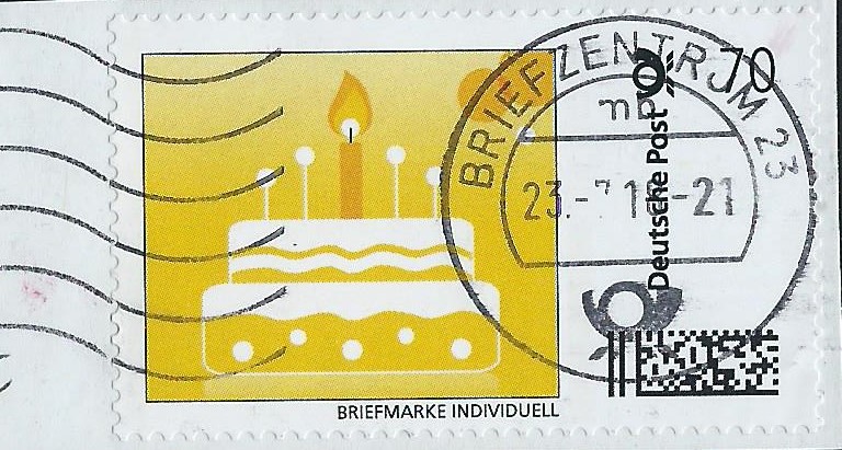ein Neuzugang der Marke Individuell: Aus dem Posteingang der letzten Tage habe ich von einem Kollegen diesen Briefausschnitt erhalten. Das Motiv der 70 ct-Marke zeigt eine Torte mit Kerzen, vermutlich eine Marke als Gruss zum Geburtstag? Text ist jedenfalls keiner darauf enthalten. Gestempelt wurde die Marke am 23.7.18 im Briefzentrum 23.
