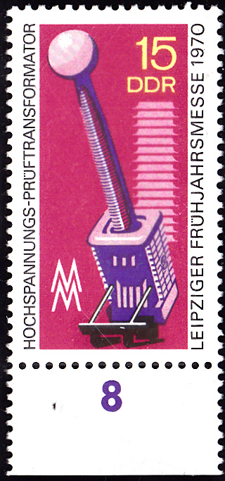 Auf der zweiten Marke (MiNr 1552) wird ein Hochspannungs-Prüftransformator gezeigt.