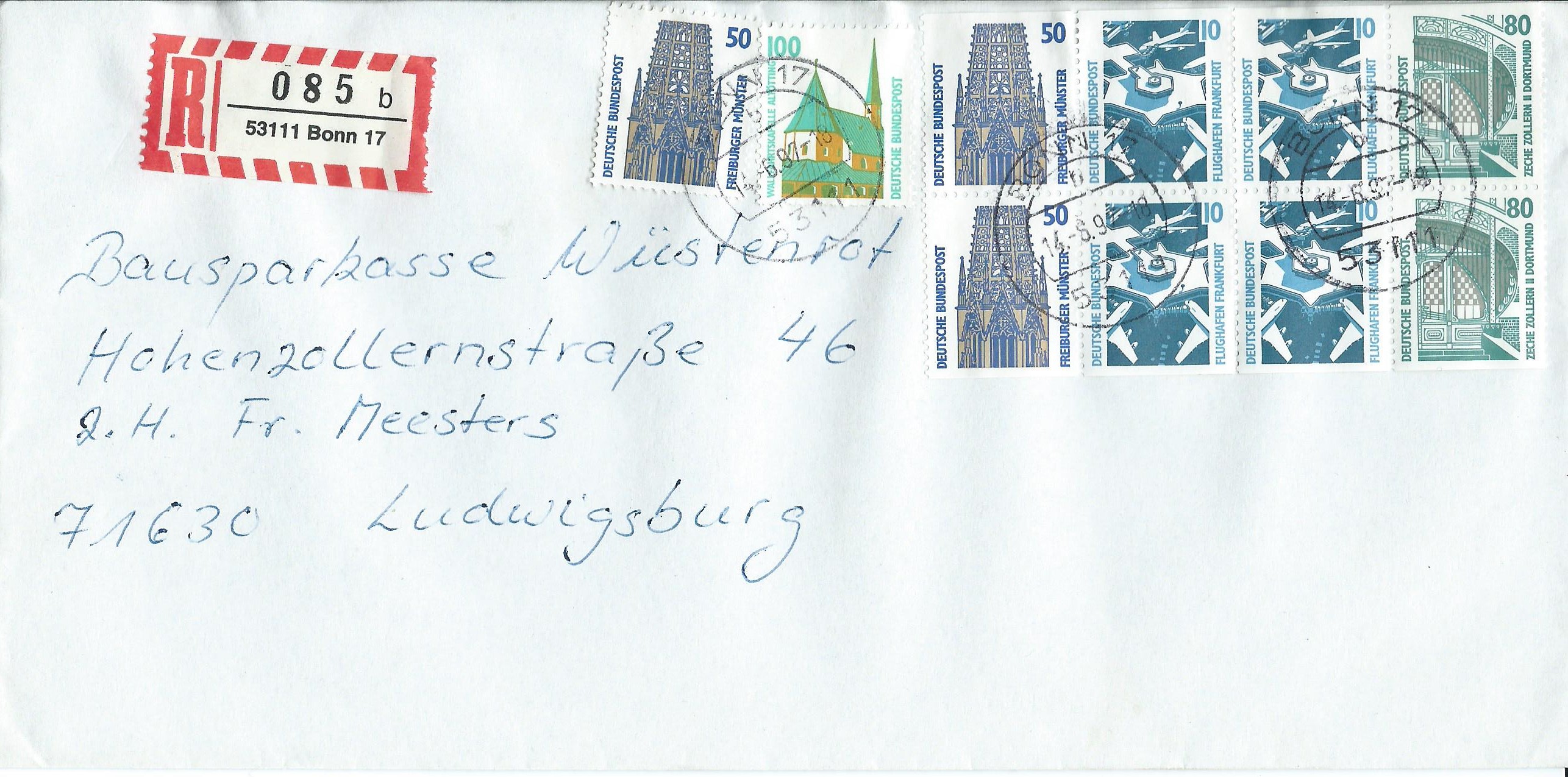 von der Marke zu 33 Pf gab es nicht viele Möglichkeiten, sie portorichtig auf Beleg zu belegen. Hier ist mal ein Beleg, bei dem alles passt. Es klebt ein waagerechter 10-er-Block vom rechten Bogenrand auf dem Beleg, der als Einschreiben verschickt wurde. Die Einschreibgebühr betrug 2 DM, der Brief selber als Brief über 20 bis 50 Gramm kostete 1,30 DM, zusammen 3,30 DM. Also eine schöne Mehrfachfrankatur. Gestempelt wurde der Brief am 19.1.89 in München.