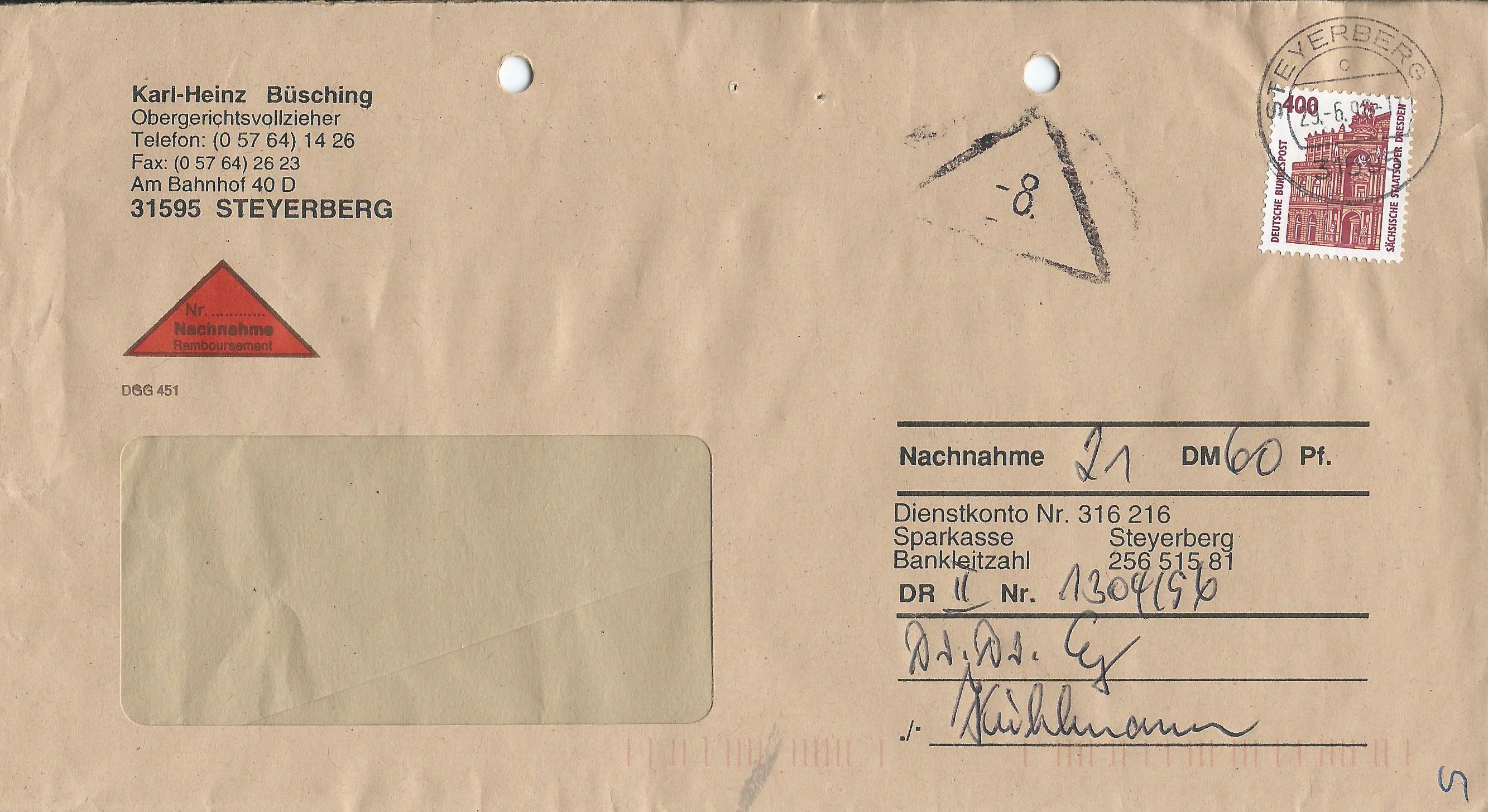 Beginnen möchte ich mit einem Einschreiben mit Rückschein, welches mit je einer Marke zu 300 und 500 Pf frankiert wurde. Abgestempelt ist der Beleg am 27.5.97 in Brandenburg an der Havel.
