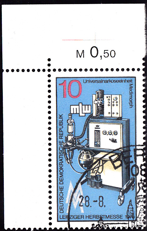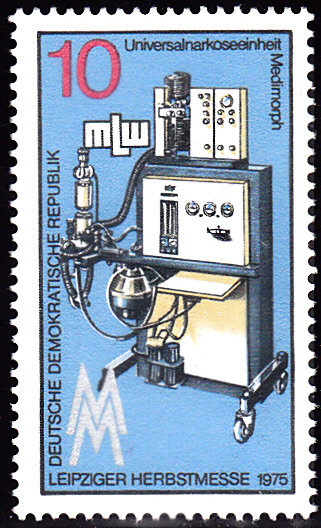 Zur Leipziger Herbstmesse 1975 sind zwei Marken erschienen. Auf der Marke zu 10Pf (MiNr 2076) ist eine Universalnarkoseeinheit Medimorph abgebildet.