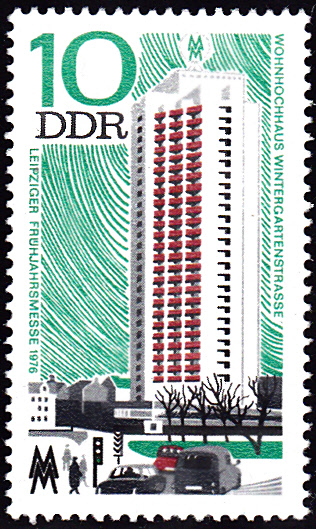 Auf einer Marke zu 10Pf (MiNr 2119) wird ein Wohnhochhaus in der Wintergartenstraße in Leipzig gezeigt.