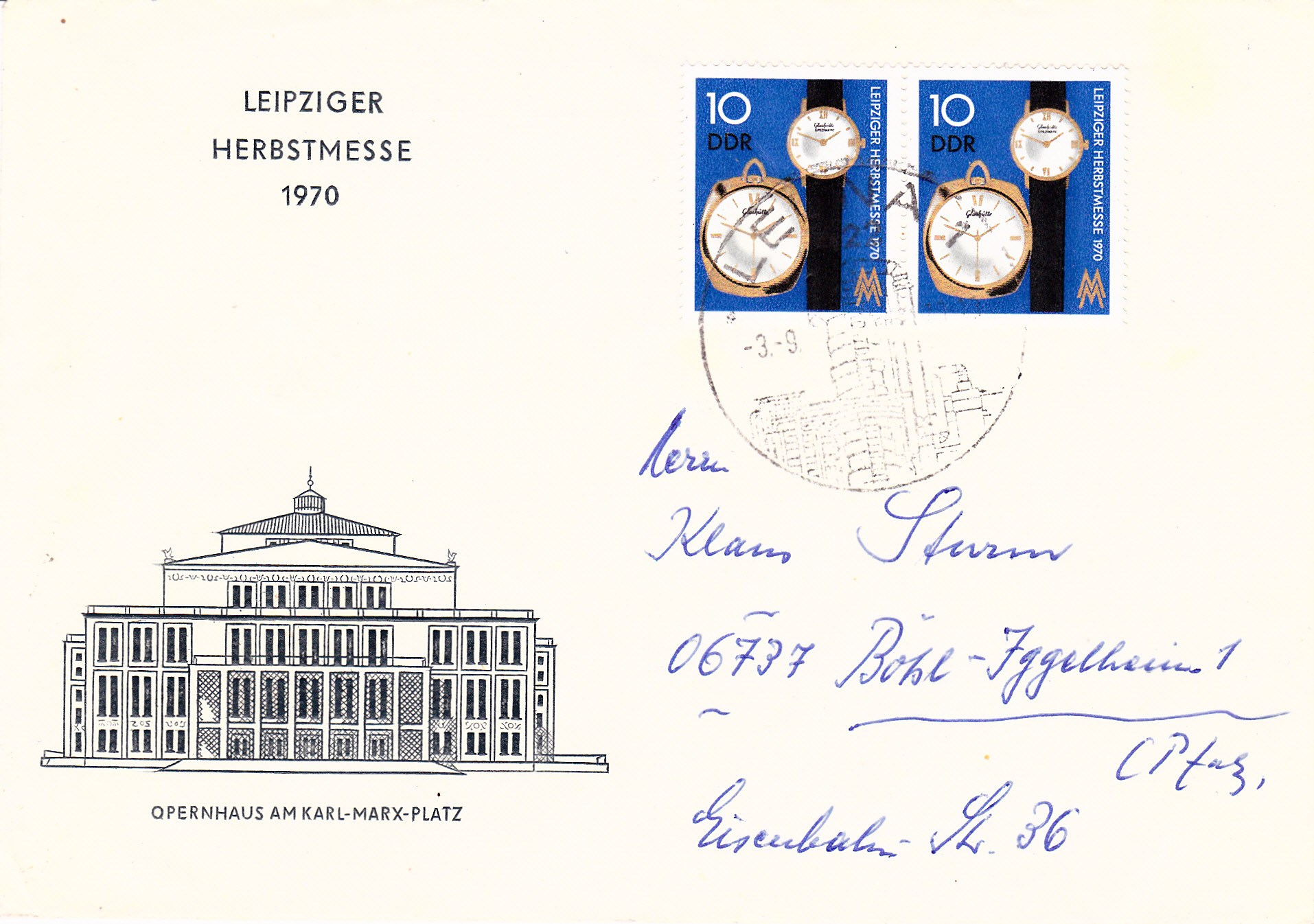 Ein Paar der Marke zur Leipziger Herbstmesse 1970 (MiNr 1610) ist auf diesem Brief von Leuna nach Böhl-Iggelheim portogerecht zur Frankatur eines Standardbriefes verwendet worden.