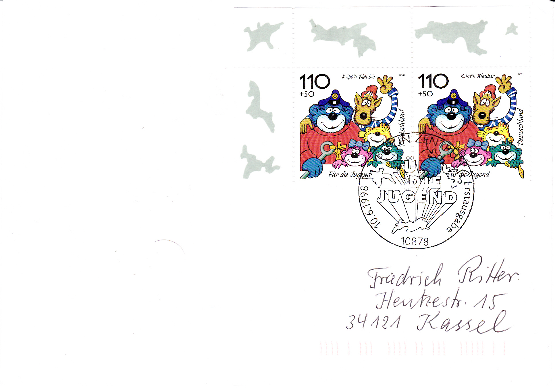 Paar vom linken oberen Bogenrand des 110 - 50 Pfennigwertes "Käpt'n Blaubär" (MiNr 1993) aus der Jugendmarkenserie 1998 auf einem Ersttagsbrief von 21 bis 50 g mit Ersttagsstempel Berlin.