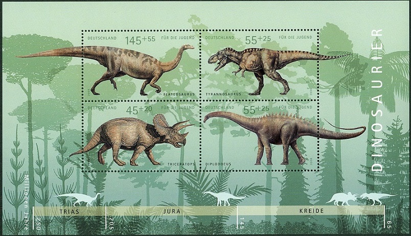 Der Apatosaurus („trügerische Echse“), er wird auch Brontosaurus („Donnerechse“) genannt, ist eine Gattung sauropoder Dinosaurier, aus der Familie Diplodocidae. Sie zählt zu den bekanntesten Dinosauriern. Apatosaurus lebte im Oberjura, seine Fossilien wurden in den westlichen USA (Colorado, Oklahoma, Wyoming und Utah) gefunden. Er erreichte eine Länge von 21 bis 26 Metern und sein Gewicht wird auf 30 bis 35 Tonnen geschätzt. Er war kräftig gebaut, aber nicht so lang wie der nah verwandte, ähnlich gebaute Diplodocus, der auch auf der bereits gezeigten Blockausgabe mit den Jugendmarken 2008 zu sehen ist. Er war wie alle Sauropoden ein Pflanzenfresser. Parallel verlaufende, versteinerte Fußspuren zeigen, dass er zumindest zeitweise in Herden lebte.