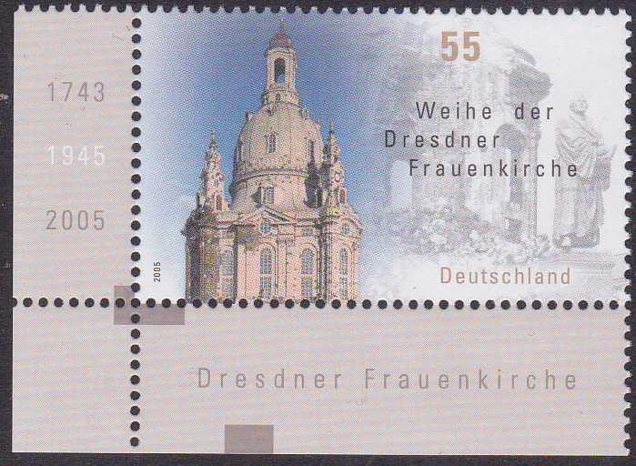 Zur Weihe der Dresdner Frauenkirche ist bei der Deutschen Post 2005 eine Marke (MiNr 2491) erschienen. Die Marke zeigt die Ruine und die Rekonstruktion der Frauenkirche.