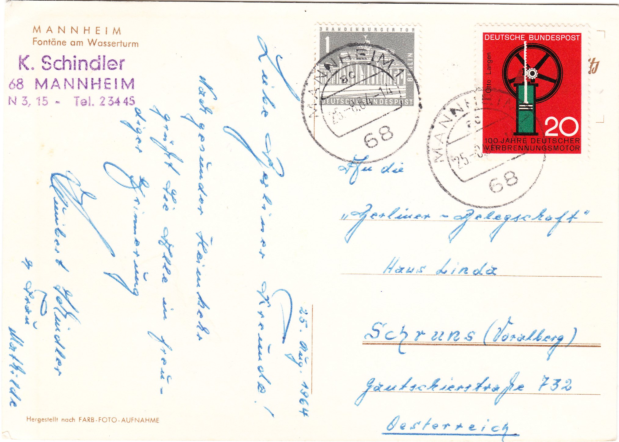 Hier eine Postkarte ab Mannheim nach Österreich, die am 25.08.1964 ein Porto von 20 Pfennig kostete und bei der in diesem Falle die 1 Pfennig Marke zusätzlich aus Solidarität für Berlin verklebt wurde: