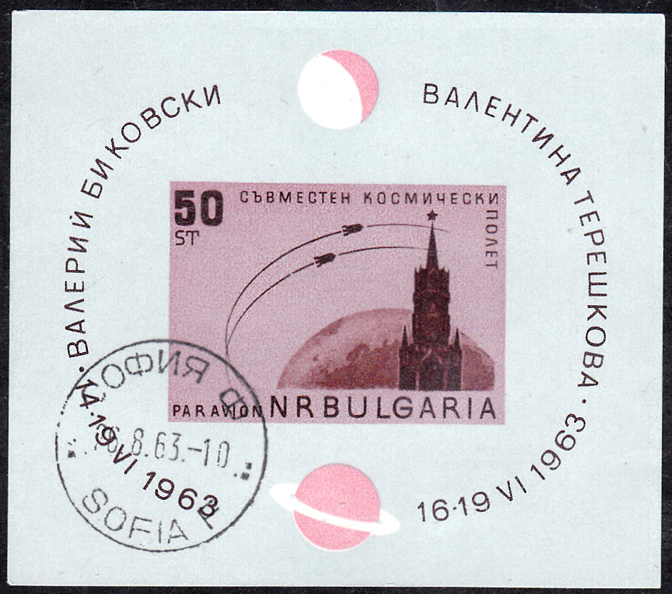 Dieser Block aus Bulgarien (MiNr Block 10) mit einer Marke (MiNr 1398) erschien am 26.8.1963 zum Gruppenflug von Wostok 5 und 6., Im Markenbild werden die beiden Flugbahnen die Erdkugel und der Spasskij-Turm gezeigt.