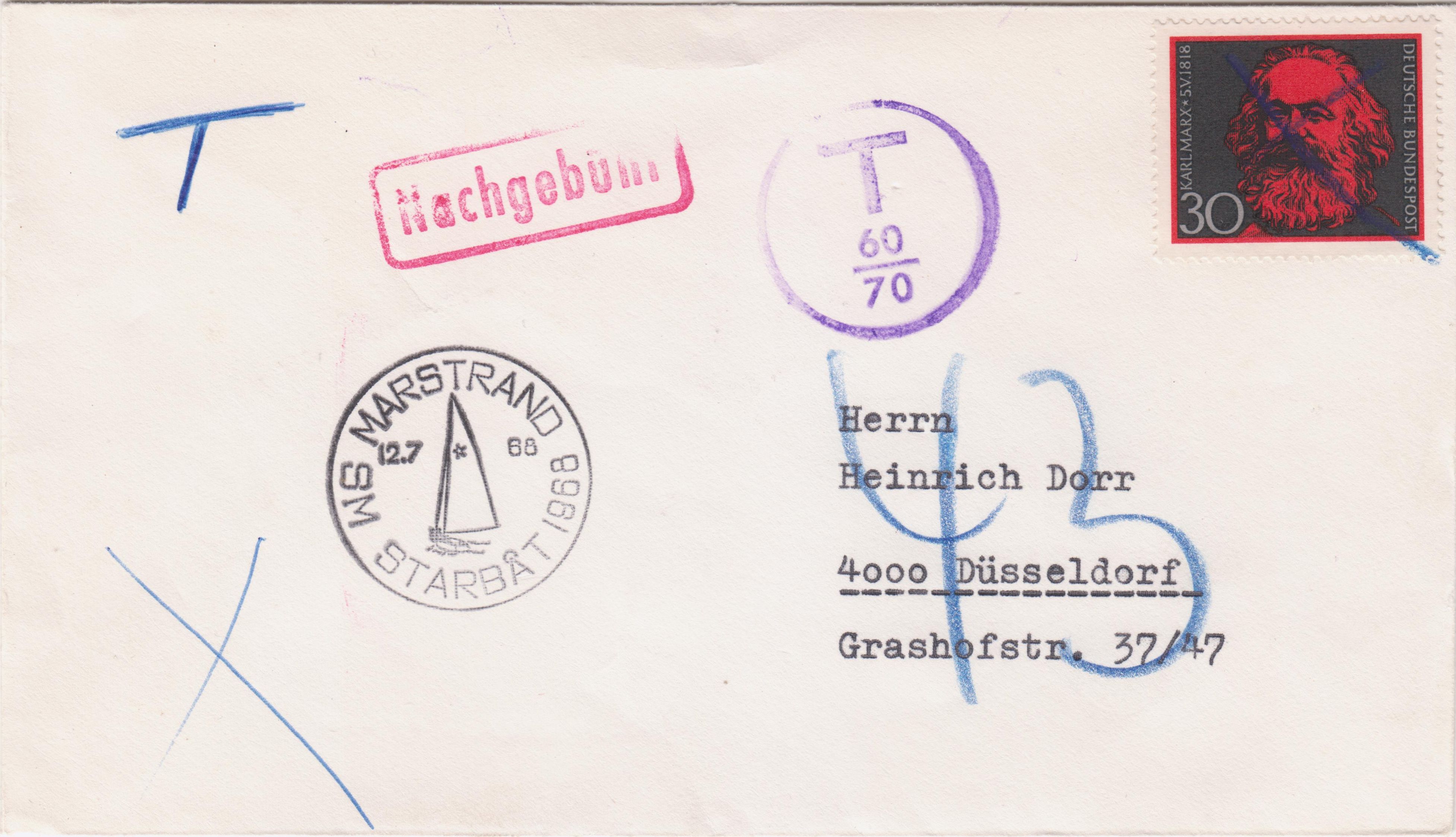 Dieser nach Düsseldorf adressierte Brief wurde, "frankiert" mit einem in Schweden ungültigen Postwertzeichen "Karl Marx" der Deutschen Bundespost, am 12.07.1968 in MARSTRAND aufgegeben und dementsprechend mit 43 Pfennig "Nachgebühr" belegt: