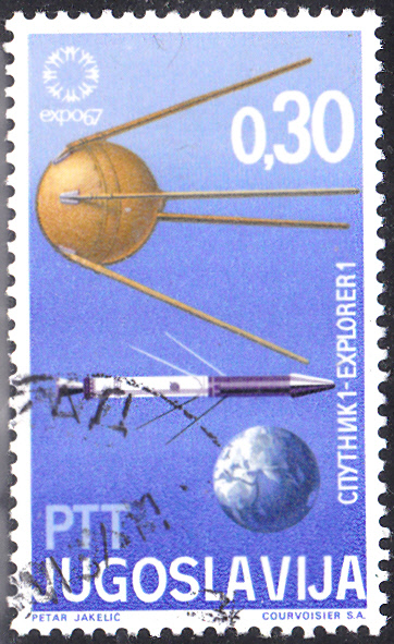 Eine Marke aus einer Serie aus Jugoslawien (MiNr 1216) zur Weltausstellung EXPO ’67 im Montreal; und zum 18. IFA-Kongress in Belgrad zeigt im Markenbild Sputnik 1 (oben) und Explorer 1 (unten).