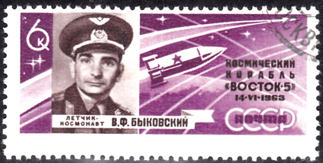 Zum Gruppenflug der Raumschiffe Wostok 5 und Wostok 6 ist in der Sowjetunion in einer Serie diese Marke (MiNr 2769 A) mit einem Porträt von Walerij Bykowskij (Kosmonaut von Wostok 5) und der Abbildung einer Rakete erschienen.