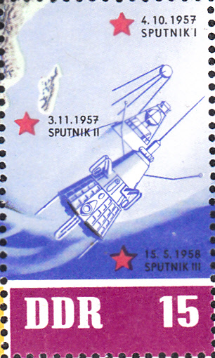 Auf einer Marke aus der Serie "Tag der Kosmonauten" 1964 (MiNr 2895 A) werden Sputnik 1, Sputnik 2 und Sputnik 3 gezeigt.