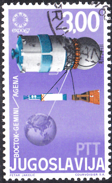 Auf dieser Marke aus einer Serie aus Jugoslawien (MiNr 1220) sind eine der Raumkabinen "Wostok" und "Gemini" mit der "Agena"-Oberstufe der Trägerrakete (unten) abgebildet. Es scheint sich hierbei um Gemini 8 kurz vor der Kopplung mit Agena zu handeln.