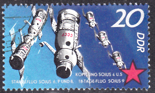 Diese Marke (MiNr 1639) der Ausgabe "10 Jahre bemannte sowjetische Weltraumflüge" aus der DDR bildet ganz links die beiden gekoppelten Raumschiffe Sojus 4 und Sojus 5 ab.