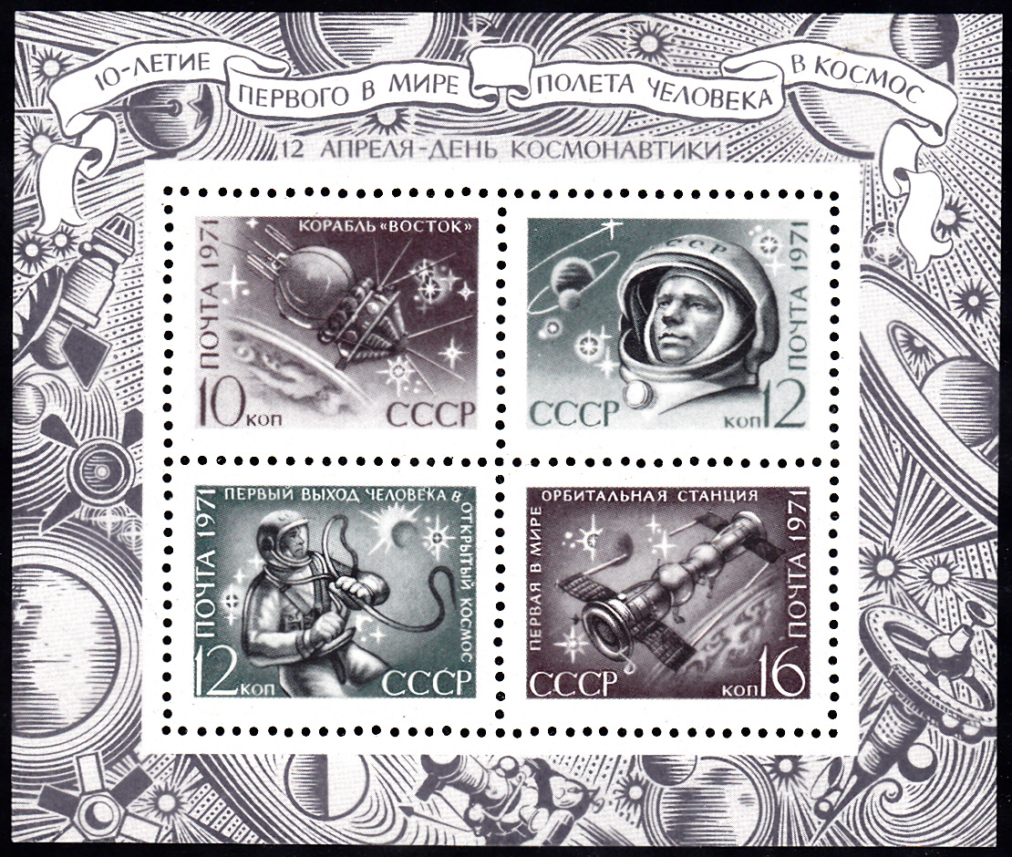 Auf dieser Marke aus der Sowjetunion zum "Tag der Kosmonauten" 1971 (MiNr 3874) das Kopplungsmanöver der Raumschiffe Sojus 4 und Sojus 5 dargestellt.