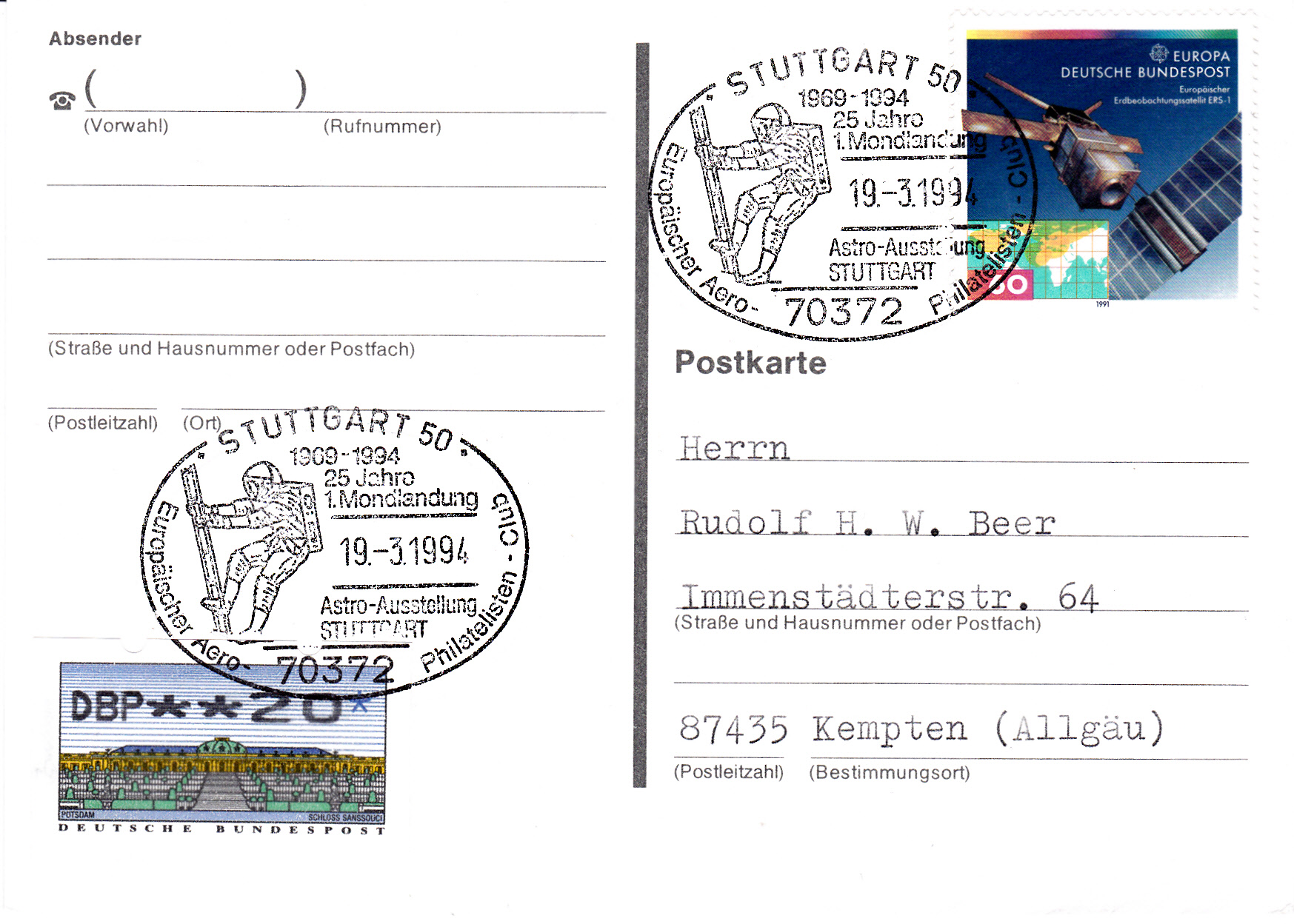 In den USA erschienen im Jahre 1994 zum 25. Jahrestag der ersten bemannten Mondlandung zwei Marken. Im Markenbild wird ein salutierender Astronaut mit US-Flagge auf dem Mond gezeigt.