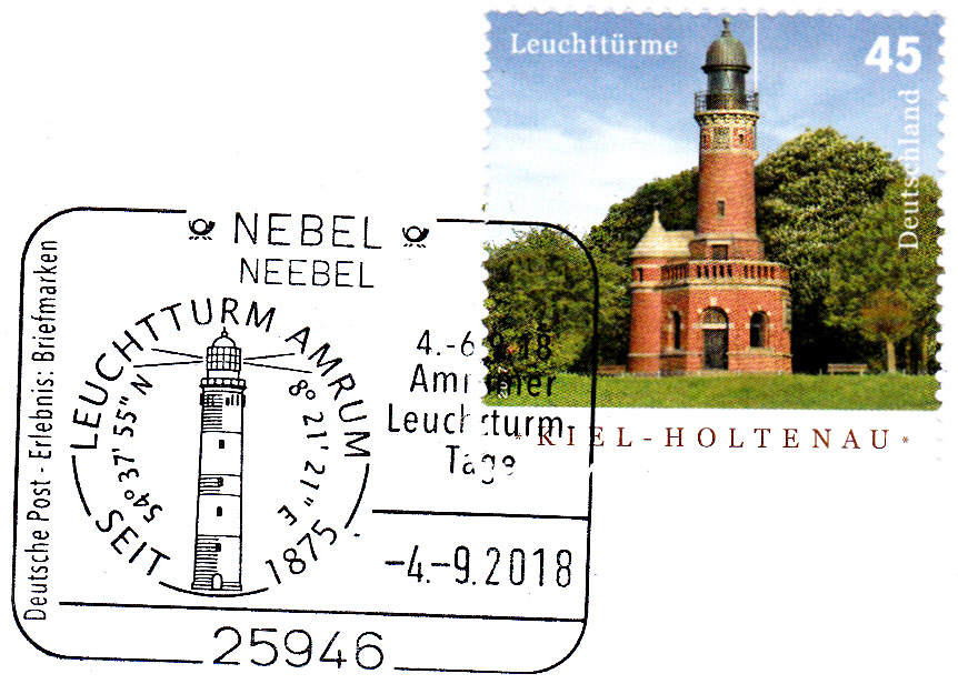 Auch zu den Amrumer Leuchtturmtagen vom 4.-6.9.2018 wurde in Nebel am 4.9.2018 ein Sonderstempel eingesetzt. Er zeigt wieder im Stempelbild den Leuchtturm Amrum.