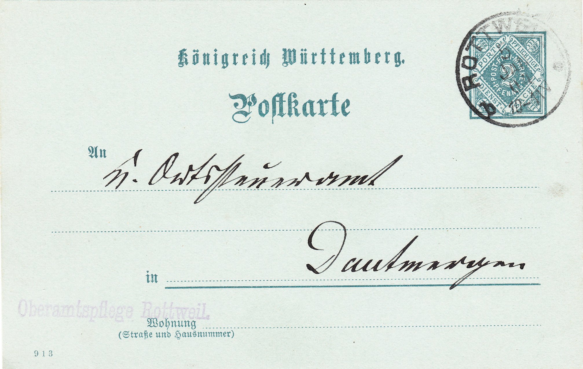 Dautmergen gehörte zum Oberamt Rottweil, weshalb in diesem Falle auch bei einer Entfernung von 15 km der ermäßigte Tarif von 2 Pfennig für den Oberamtsverkehr galt.