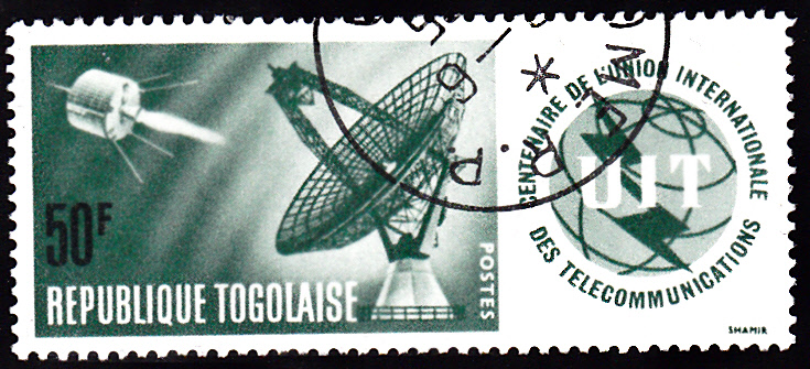 Auch in Togo erschien in eine Serie "100 Jahre Internationale Fernmeldeunion" mit Marken mit einem Nachrichtensatelliten vom Typ Syncom. Hier zeige ich die drei ersten Marken der Serie:
