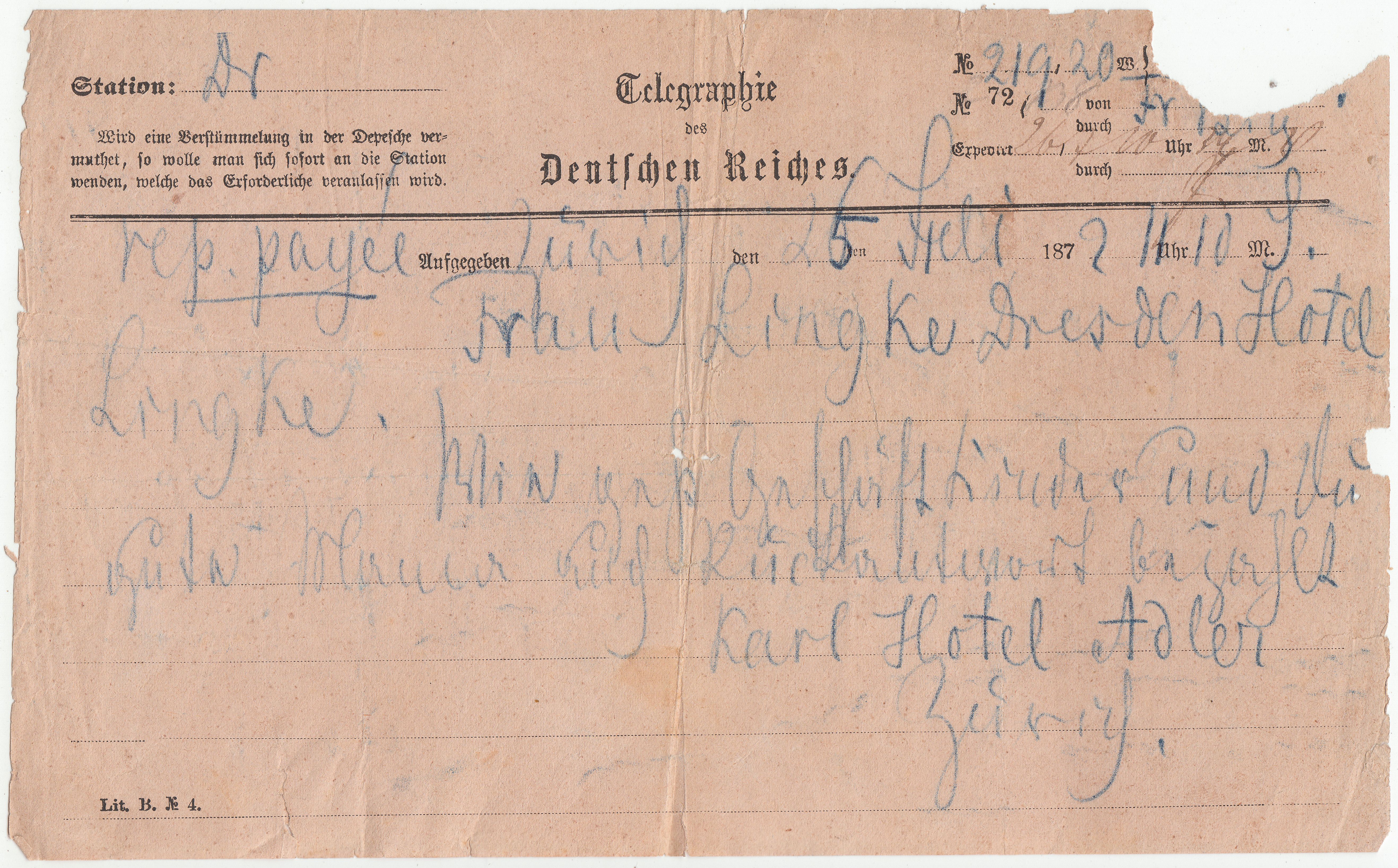 Ab 1872 war Karl Friedrich Louis Lingke der Besitzer seines gleichnamigen Hotels "Lingke" in der Dresdner Altstadt in der Seestraße 2. Dieses Telegramm wurde adressiert an "Frau Lingke Dresden Hotel Lingke".