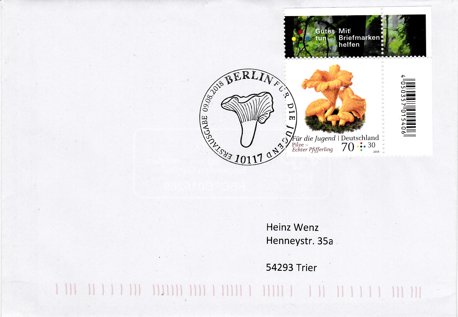 Diese Marke wurde auf diesem Brief mit dem Ersttagsonderstempel aus Berlin gestempelt. Im Stempelbild wird passend zur Marke ein Pfifferling abgebildet.