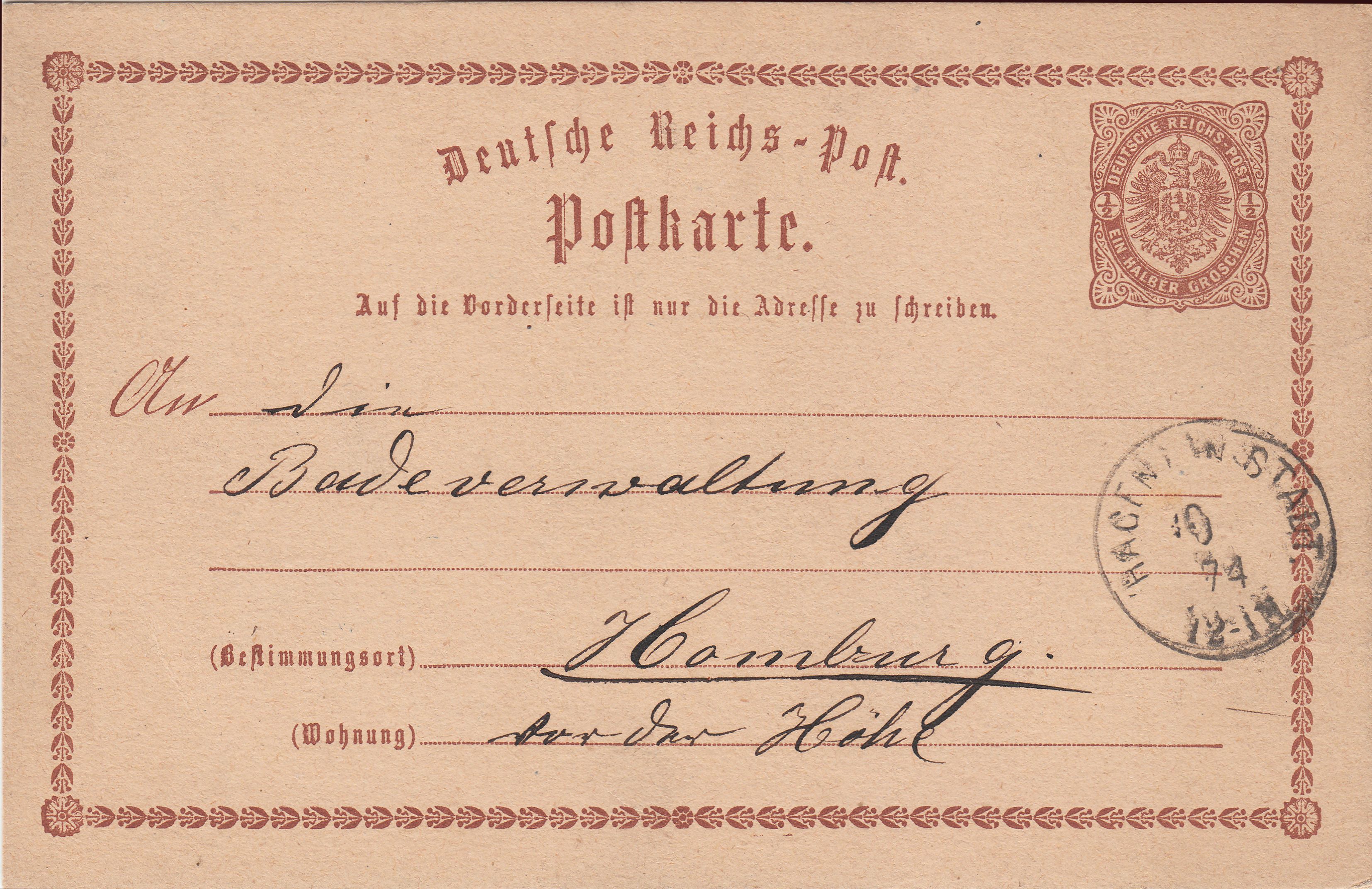 Hier eine Ganzsache MiN. P1, entwertet am 20.05.1874 per nachverwendetem NDP-Kreisstempel "HAGEN i. W. STADT.", Feuser NDP 402: