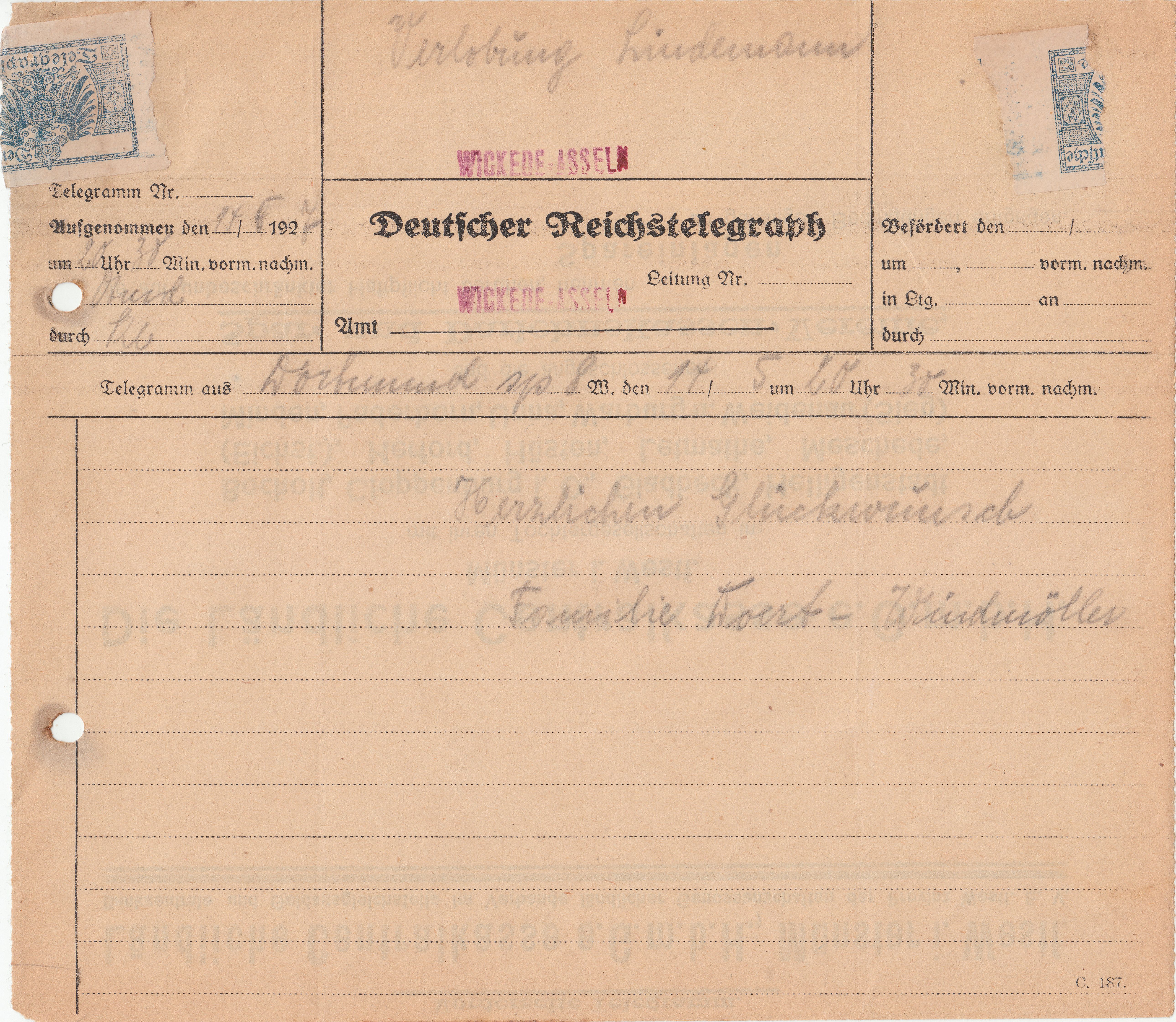 Hier ein 1927 aufgegebenes Telegramm, das mit einer aptierten Verschlußmarke mit dem Reichsadler mit großem Brustschild verschlossen wurde. Hier der Originalzustand bei der Zustellung an den Empfänger in "WICKEDE-ASSELN":