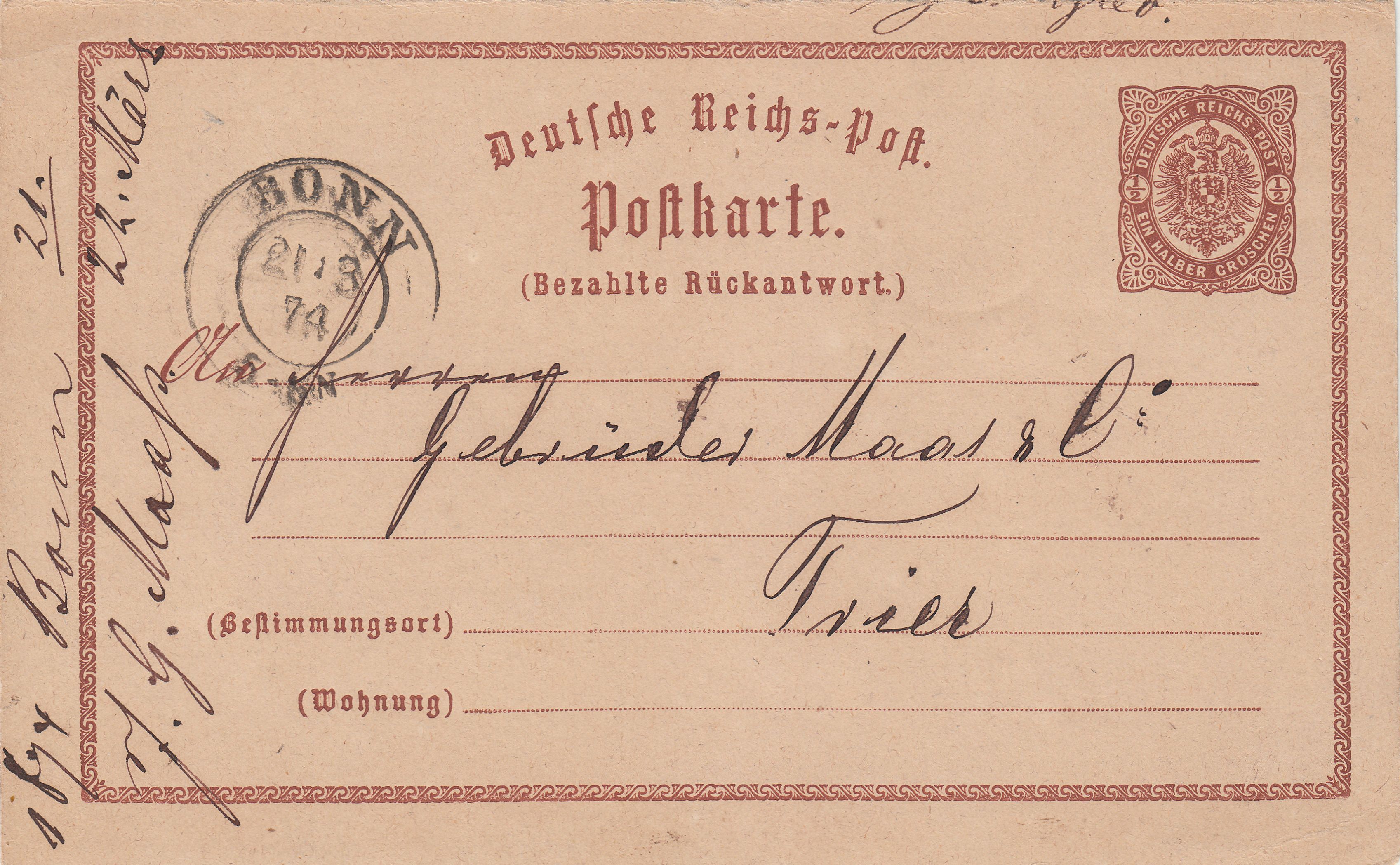 Hier eine Ganzsache MiNr. P3A, also der Antwortteil "(Bezahlte Rückantwort.)" der Doppelkarte MiNr. P3, entwertet am 21.03.1874 per nachverwendetem preussischem Zweikreisstempel "BONN", Feuser Pr 378: