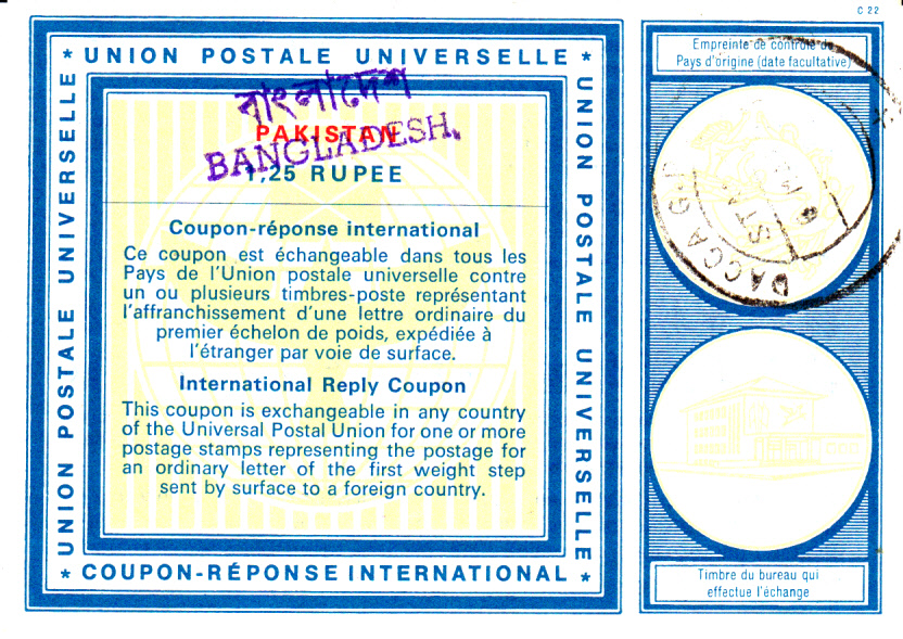 Hier nun ein paar Beispiele für Internationale Antwortscheine aus Pakistan zu einem Verkaufspreis von 1,25 Rupien, bei denen die Landesbezeichnung "Pakistan" mit Handstempelaufdrucken Bangladesch versehen wurden. Es sind die gleichen Handstempeltypen möglich, wie bei Briefmarken.