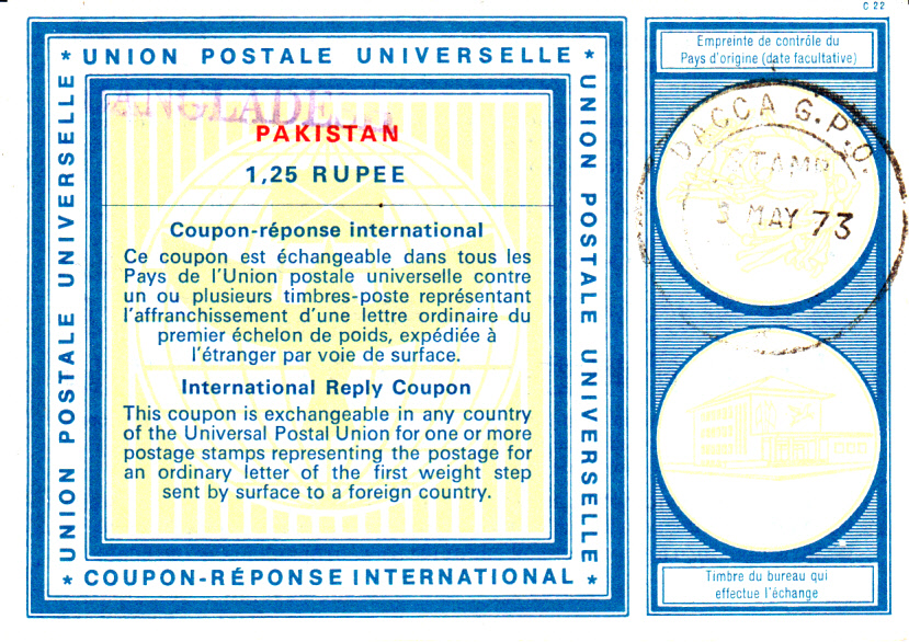 Es gibt auch Antwortscheine, die nicht in allen UPU-Ländern eingelöst werden, sondern z.B. nur in Ländern aus dem Commonwealth. Ich zeige hier nun einen dieser "Commonwealth Reply Coupons" aus Pakistan mit Handstempel Aufdruck Typ F ausgegeben am 17.9.1973 beim Postamt Rajshahi H.O.