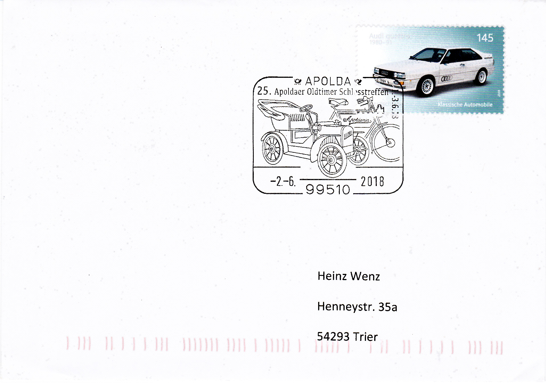 Im Bild dieses Sonderstempels aus Apolda vom 2.6.2018 zum 25. Apoldaer Oldtimertreffen wird ein Piccolo abgebildet. Im welchen Typ es sich genau handelt ist mit zur Zeit nicht bekannt.