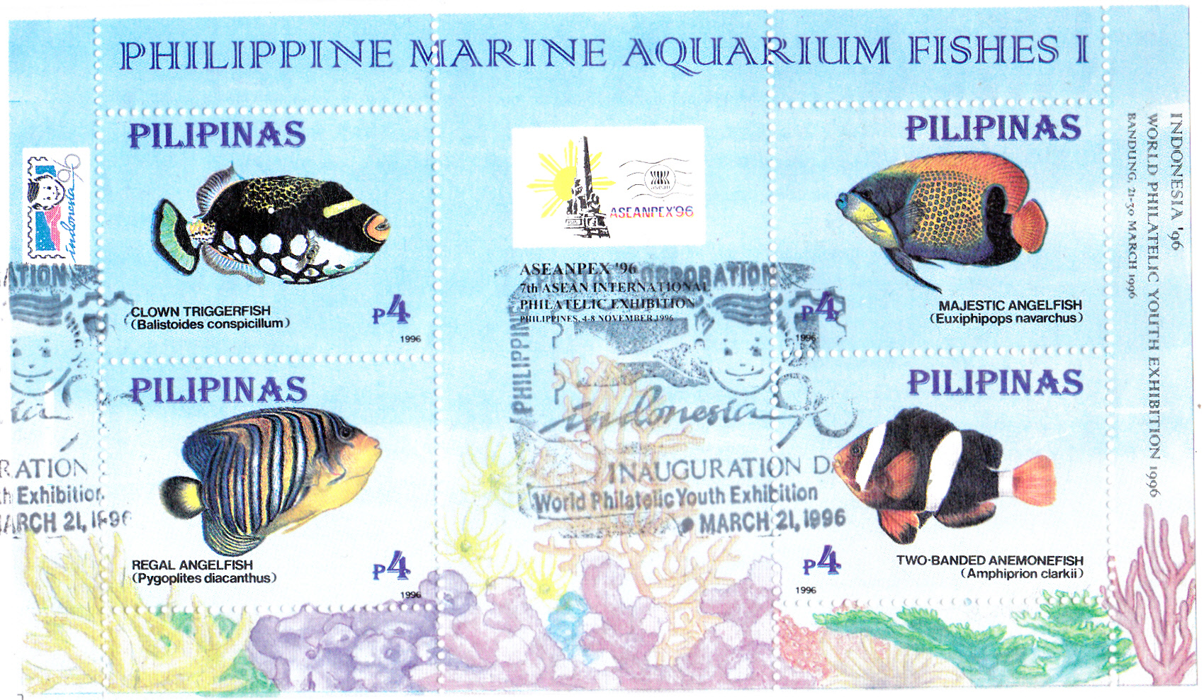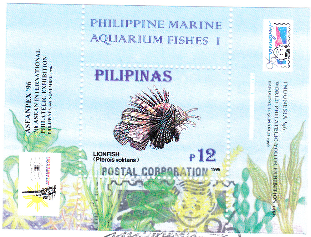 Zur Internationale Briefmarkenausstellung ASEANPEX ’96 in Manila erschien auf den Philippinen eine Marke (MiNr 2662) in einem Block (MiNr Block 95) mit der Abbildung eines Pazifischen Rotfeuerfisches (Pterois volitans). In einer Neuauflage ist auch ein Block zur Internationale Briefmarkenausstellung INDONESIA ’96 in Bandung mit einem zusätzlichen Ausstellungsemblem und zusätzlicher Inschrift erschienen. Dieser Block hat die MiNr Block 95 I, den ich hier zeige.