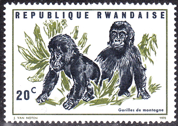 In Ruanda erschien in einer Serie "Berggorillas" diese Marke (MiNr 1242) mit der Abbildung von zwei jungen Berggorillas (Gorilla gorilla beringei).