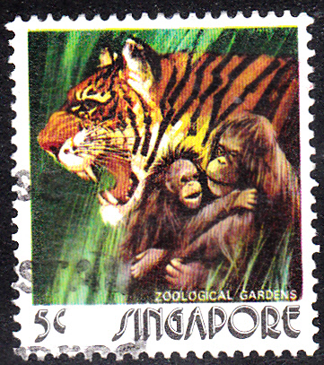 1973 ist in Singapur eine Markenserie zum Zoologischen Garten in Singapur erschienen. Hier kann ich die Marke zu 5 Cent aus dieser Serie (MiNr 205) zeigen. Zu sehen sind auf dieser Marke ein Tiger und zwei Orang Utans.