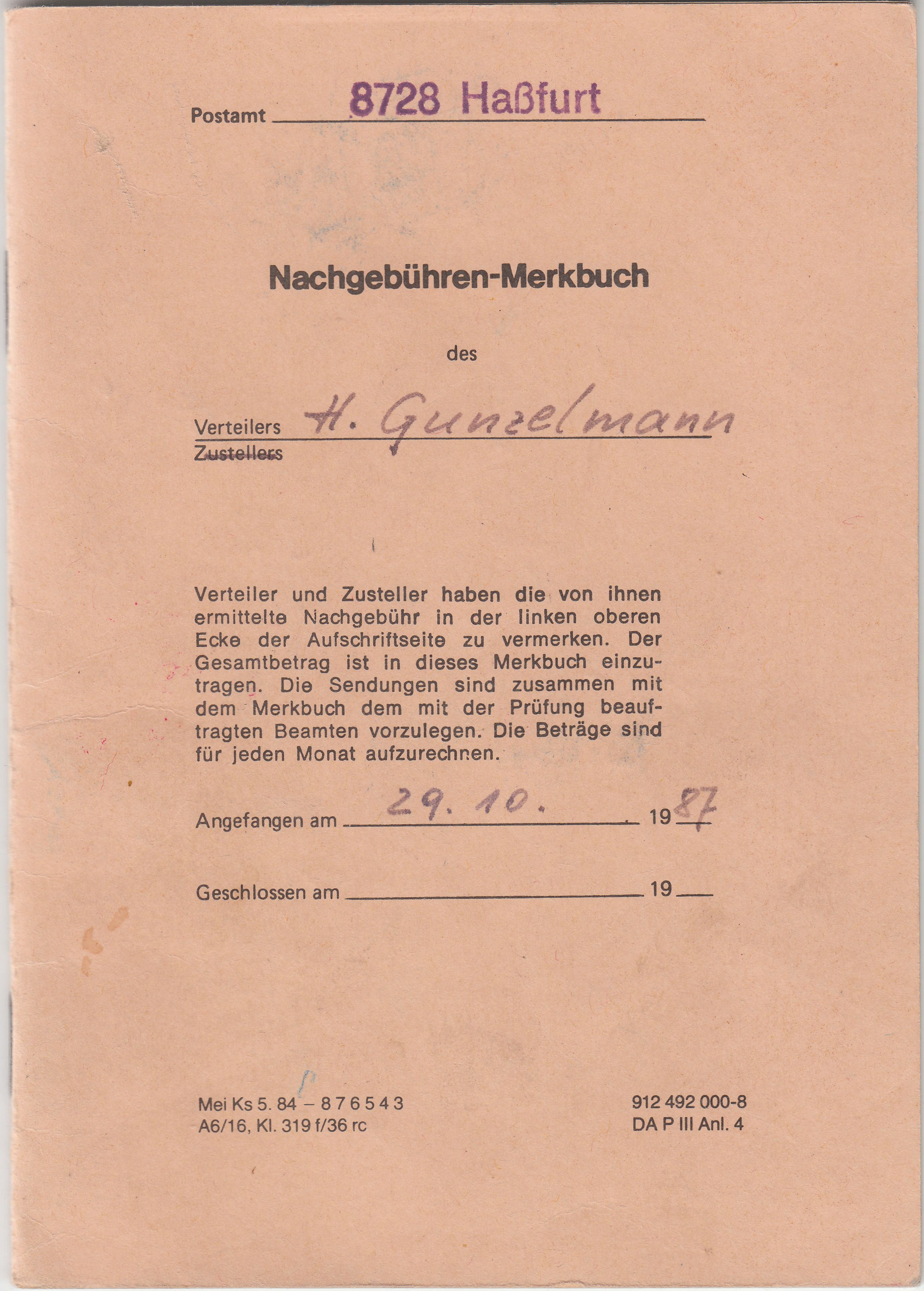 Hier ein "Nachgebühren-Merkbuch", ausgegeben vom Postamt "8728 Haßfurt" am 29.10.1987 an einen "Verteiler" mit dem Namen "H. Gunzelmann" sowie die ausgefüllten ersten Seiten daraus: