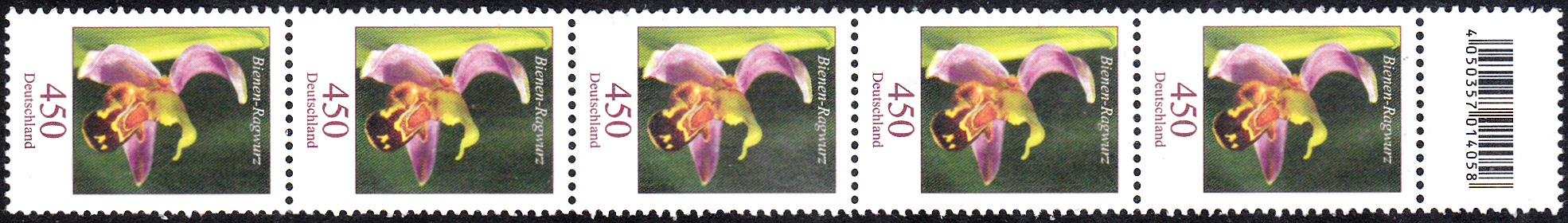Auch bei den ab 2017 gefertigten Rollen der Marke zu 450 Cent (MiNr. 3191) mit dem Motiv Bienen-Ragwurz (Ophrys apifera) folgt nach jeder 5. Marke (mit Nummer) ein kleines Zwischenfeld mit EAN-Codierung.