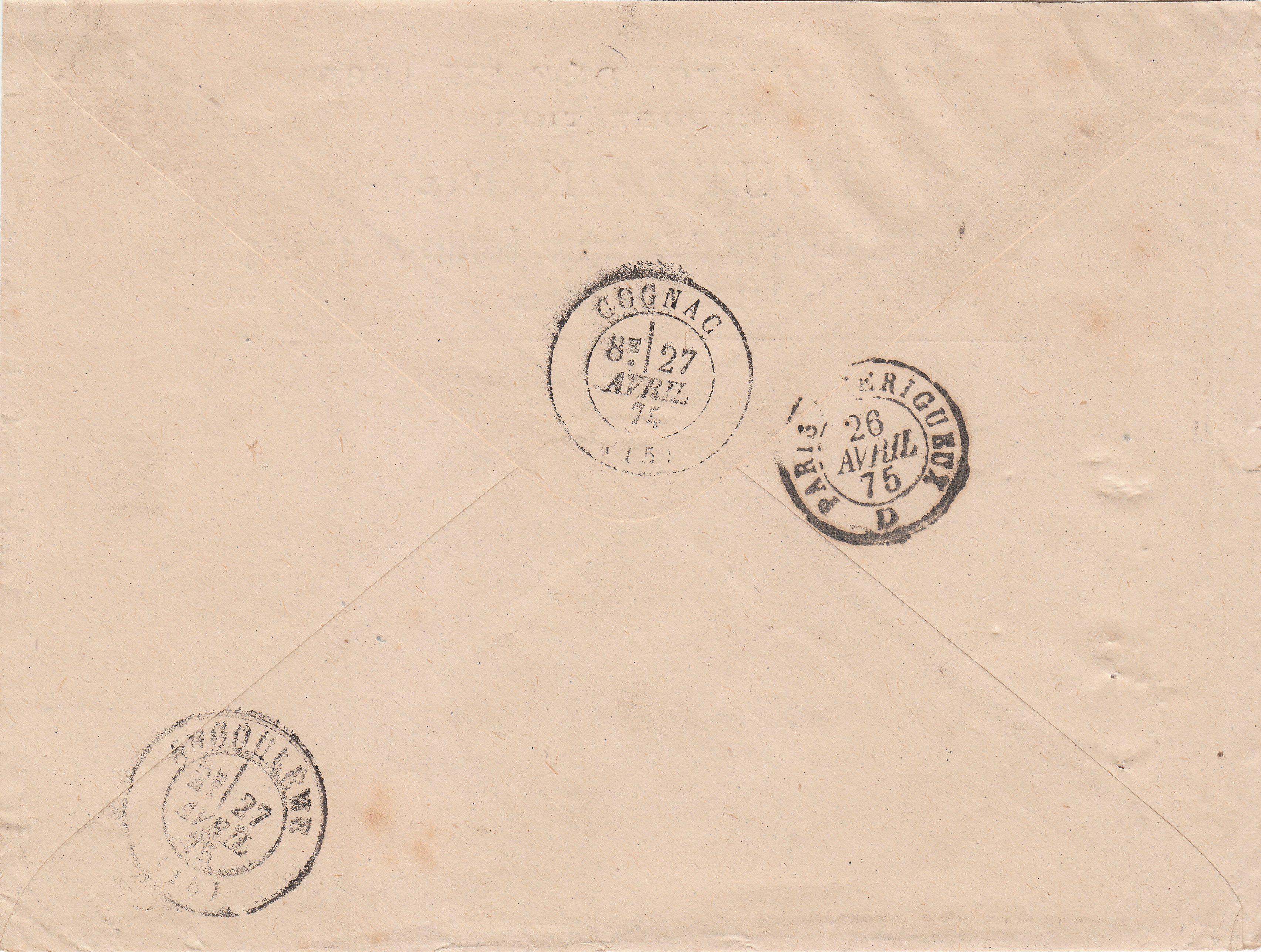 Laut rückseitig abgeschlagenem Zweikreisstempel wurde dieser Brief am 26.04.1875 per Bahnpost von Paris nach Perigueux befördert und kam am 27.04.1875 via "ANGOULEME" an seinem Bestimmungsort "COGNAC" an.