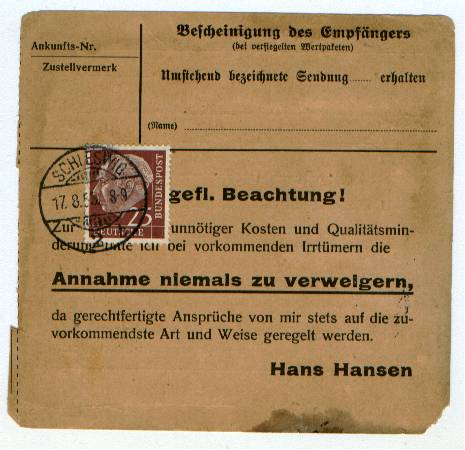 Deine 2 Marken sind aber auch nicht von schlechten Eltern! ;) Hier noch ein kleiner Nachschlag: Heuss I 25 Pf auf Rückseite einer Paketkarte mit Kreisgitterstempel von Schleswig vom 17.8.58: