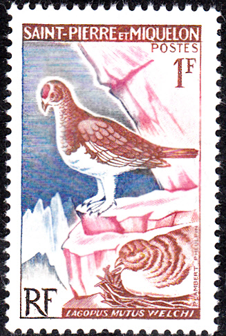 Auf dieser Marke aus St. Pierre und Miquelon (MiNr 399) sehen wir zwei Alpenschneehühner (Lagopus muta), eines davon beim Brüten, in der Unterart Lagopus mutus welchi.