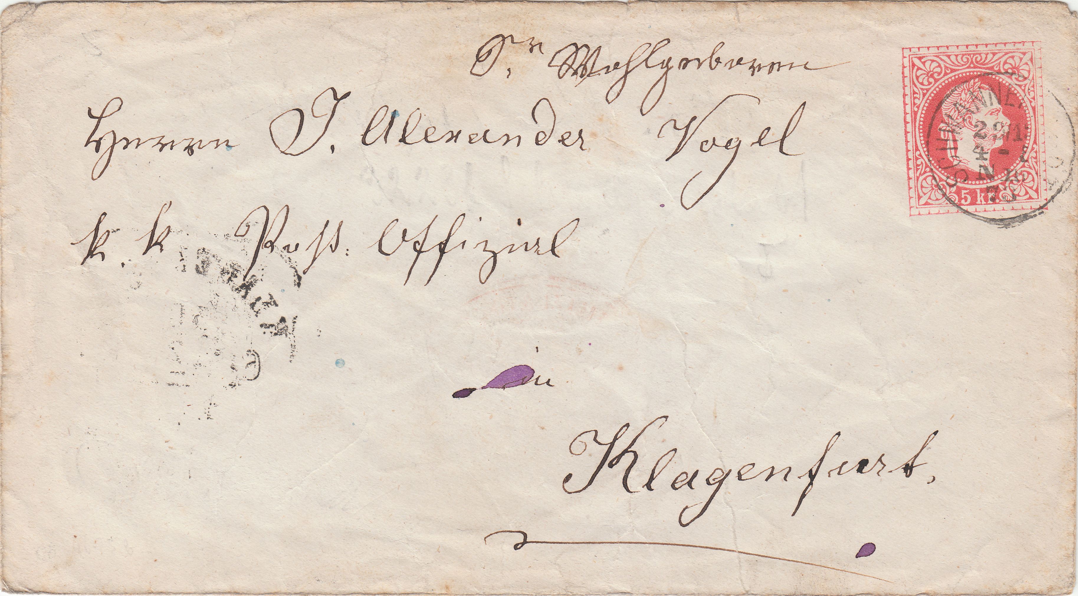 Rückseitig wurde am 30.12.1873 ein Achteckstempel "KLAGENFURT" abgeschlagen.