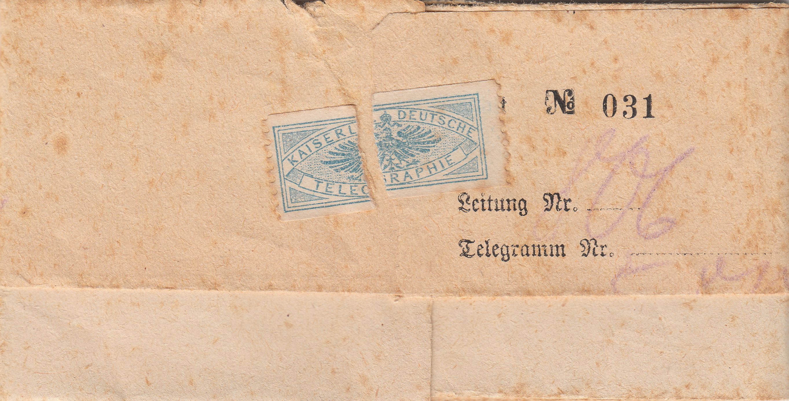 Dieses Exemplar dokumentiert ein am 05.08.1914, also direkt nach Kriegsausbruch, in "Berlin Marienfelde" aufgegebenes Telegramm, in welchem der Absender dringend um eine telegraphische Überweisung von 500 Mark bat.
