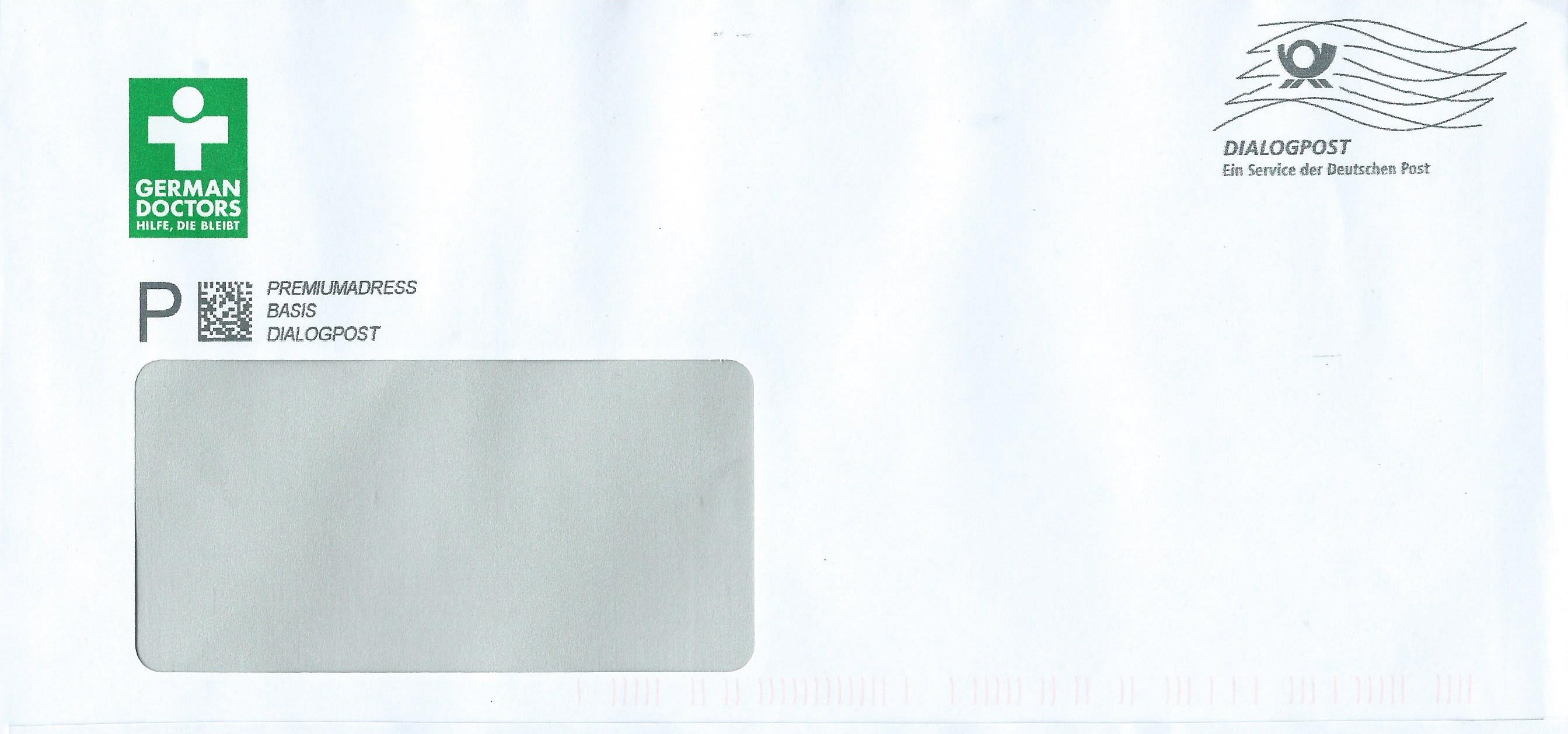 Zum einen ein Beleg der „German Doctors“ mit Frankierwelle ohne angedeutetem Wertstempel, dazu der Text Dialogpost Ein Service der Deutschen Post