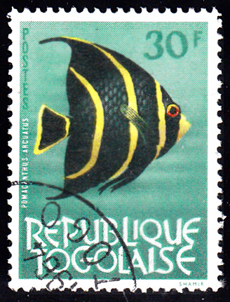 In der gleichen Serie aus Togo gibt es auch eine Marke (MiNr 397) mit einem Grauen Kaiserfisch (Pomacanthus arcuatus).