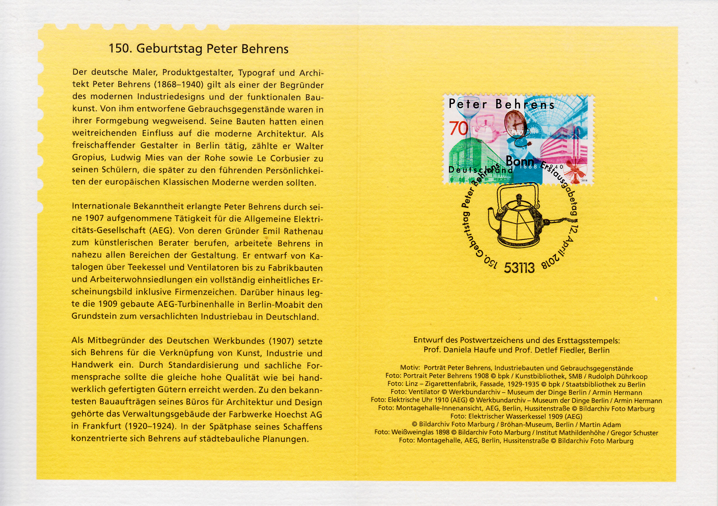 Klappkarte des Vorstandsvorsitzenden der Deutschen Post AG mit der Marke "150. Geburtstag von Peter Behrens" und dem Ersttagsonderstempel aus Bonn.