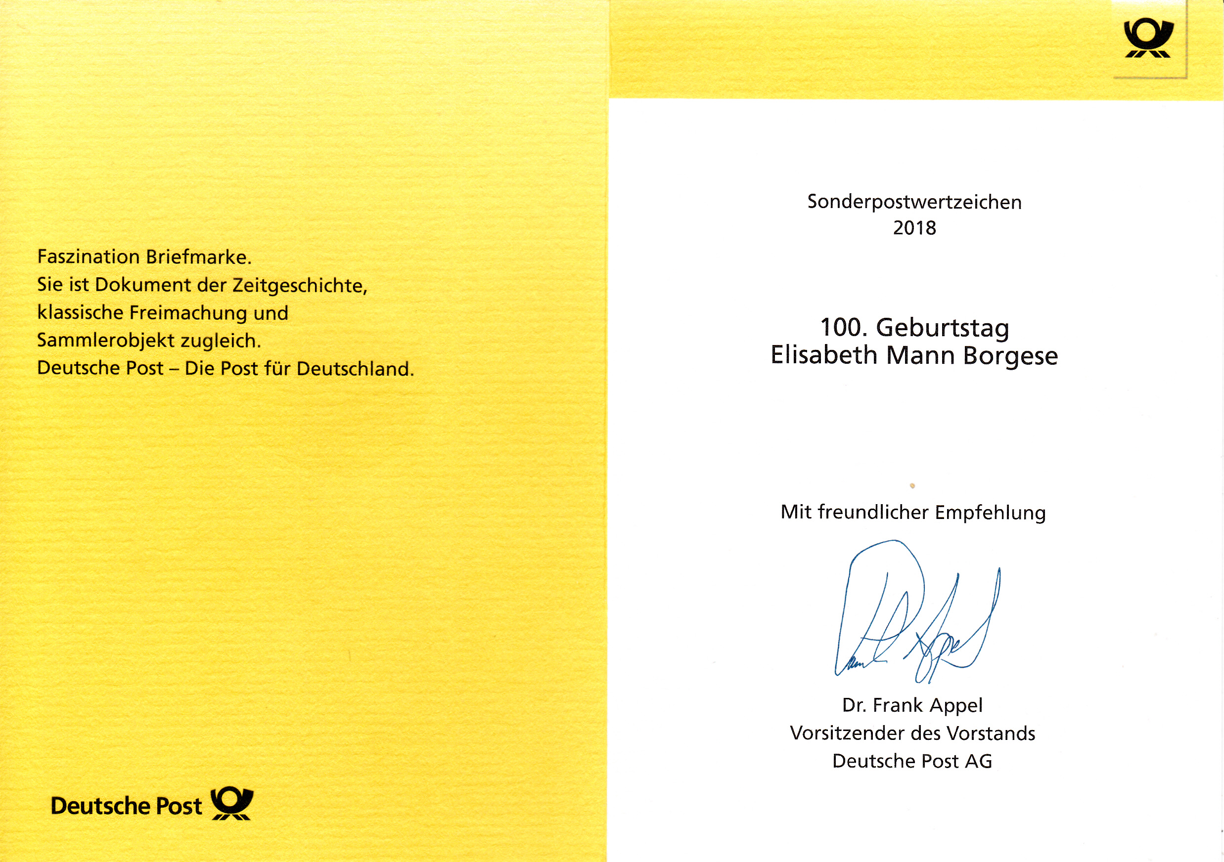 Klappkarte des Vorstandsvorsitzenden der Deutschen Post AG mit der Marke "100. Geburtstag von Elisabeth Mann Borgese" und dem Ersttagsonderstempel aus Bonn.