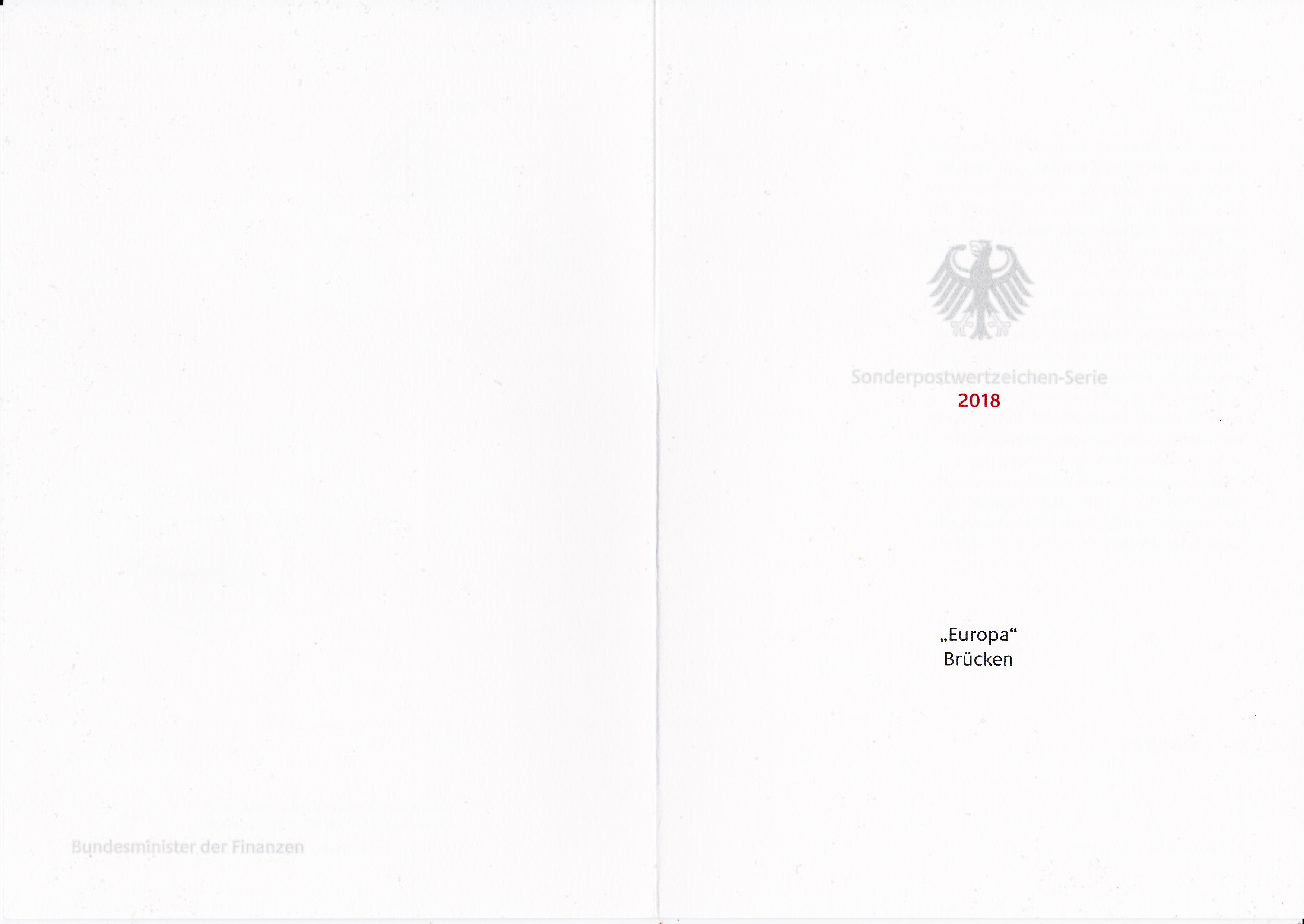 Ministerkarte mit zwei Marken Europa2018 mit dem Gemeinschaftsthema "Brücken" eine mit dem Stempel Berlin und die zweite mit dem Stempel Bonn gestempelt.