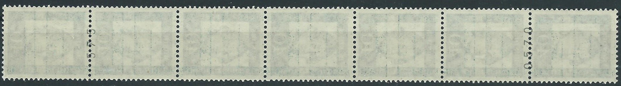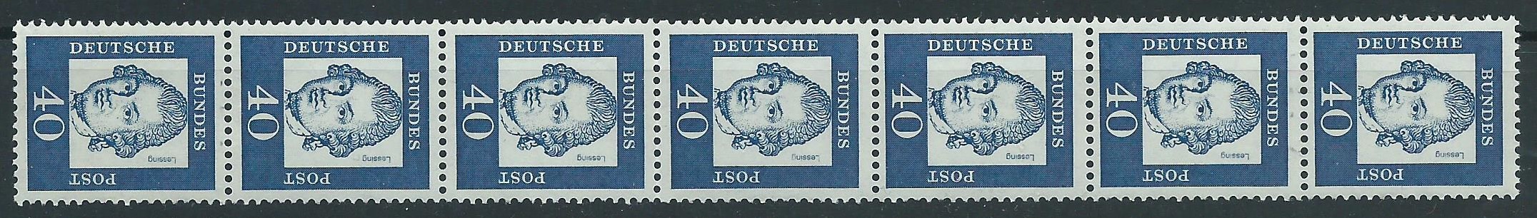von der Rollenmarke zu 40 Pf y habe ich einen 7-er-Streifen erhalten, der etwas ganz besonderes ist. Einmal sieht man auf der Gummiseite einen Abklatsch vom Markenbild. Dazu ist zwischen der 4. Und 5. Marke (von oben gesehen) ein breiter Ausgleichszahn vorhanden. Und die Krönung: Die jeweiligen Nummern stehen mitten auf der Zähnung! So etwas sieht man auch nicht alle Tage. Bezahlt habe ich dafür bei ebay ganze 5,18 €. Mein tatsächliches Gebot im Sniper lag allerdings um einiges höher, normalerweise werden solche Stücke um die 25 € aufwärts gehandelt.