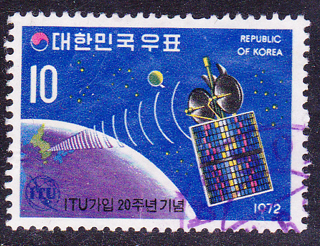 Auf dieser Marke aus Süd-Korea (MiNr 823) wird ein Nachrichtensatellit der Reihe "Intelsat IV" über Korea gezeigt.