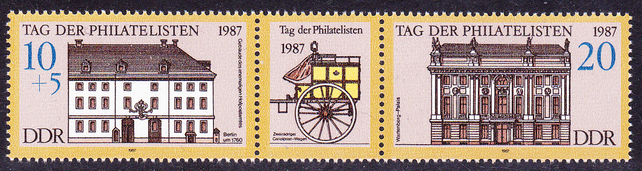 In der DDR erschien 1987 wieder ein Ausgabe zum "Tag der Philatelisten". Due beiden Marken (MiNr 3118 und 3119) wurden durch Zierfeld verbunden,waagerecht zusammenhängend gedruckt. Die Marken zeigen das ehemalige Hofpostamt in Berlin (um 1760) und das Wartenbergpalais in Berlin. Hier zeige ich einen Zusammendruck: