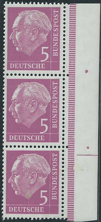 Eine postfrische senkrechte 3-er-Einheit der Marke Heuss I 5 Pf vom rechten Bogenrand. Das interessante daran sind die beiden Nadelpunkte und der Anlagestrich. Diese Anordnung war mir bis dahin so gar nicht bewusst gewesen, dass sie so existiert. Ich kannte eigentlich nur die Strichelleiste und dann vereinzelt mal die Nadelpunkte. Durch den Fund habe ich dann Nachforschungen angestellt und bin sogar fündig geworden. Es gibt ein „Bogen-Wiki“, auf dessen Seiten komplette Bogen von Marken vorgestellt werden. Darunter war dann auch ein Bogen mit der hier gezeigten Erscheinung, siehe hier: http://www.nugman.info/bogenwiki/index. ... _MiNr._179" target="_blank (etwas runterscrollen). Wie gesagt, das war vor längerer Zeit und ich war einerseits froh, das Stück so als Nachweis der Existenz zu besitzen. Das man solch ein Stück mal in gestempelter Ausführung findet, war und ist eigentlich unvorstellbar.